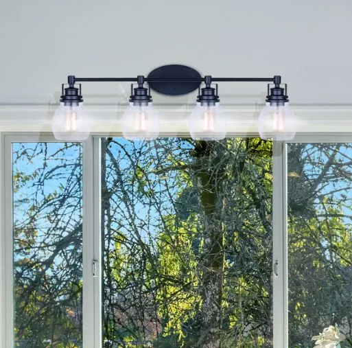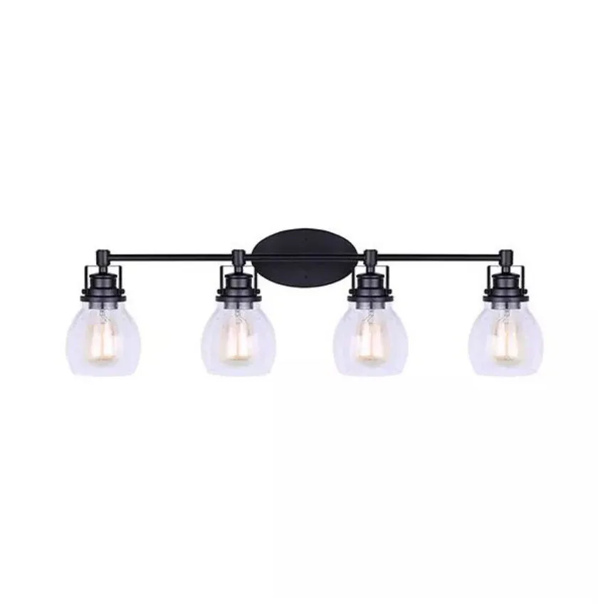 Featuring four clear seeded glass shades, this fixture can be installed facing upward or downward depending on your lighting needs and design preferences. Its matte black finish offers a bold yet timeless look, while the ability to use replaceable bulbs adds convenient long-term versatility.