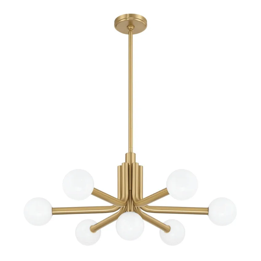 The champagne gold Stockholm chandelier is inspired by classic mid-century furniture, offering a playful yet elegant presence. Its bold tubular metal frame features softly curved arms topped with cased opal glass shades, delivering a fresh expression of mid-century style with modern sophistication. A refined and versatile 7-light design, Stockholm feels at home in a wide range of interiors.