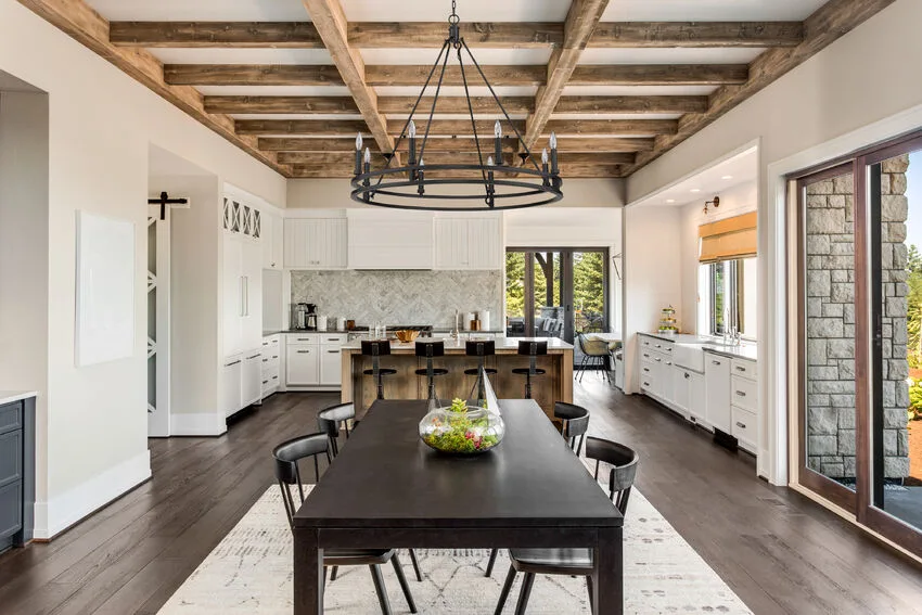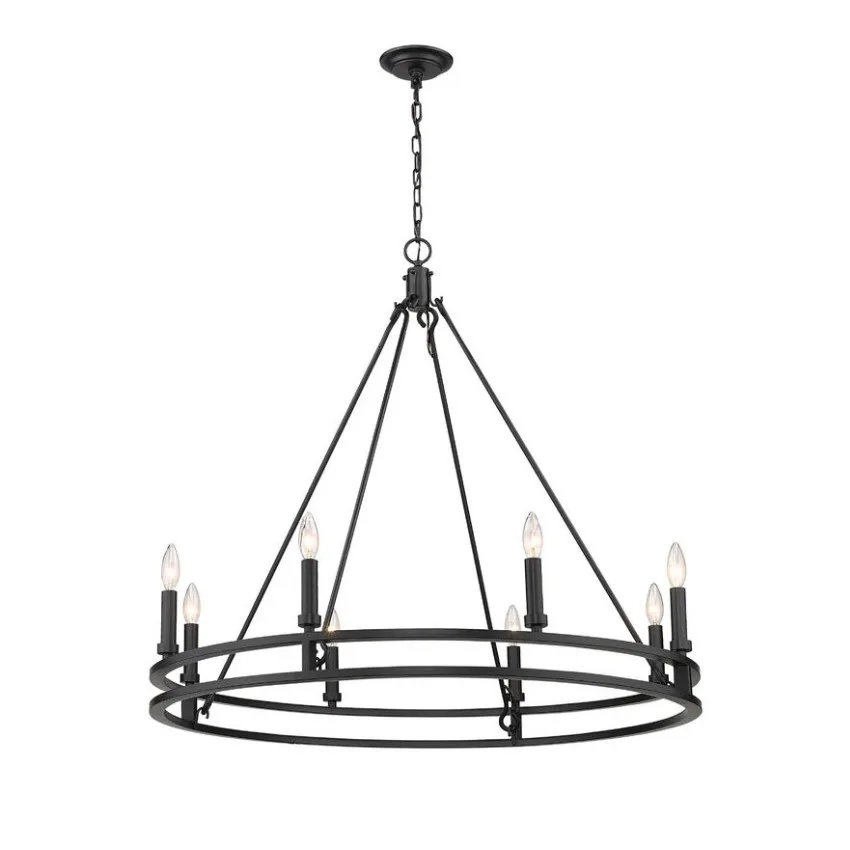Palatial elegance offers a charming attitude that illuminates a classic custom space. This eight-light chandelier adopts a dramatic aesthetic with geometric influence and a sleek Modern Matte Black finish metal ring frame that adds character and style in a transitional living area.