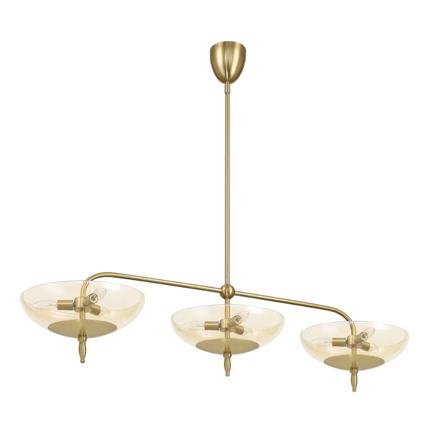 The Fiorello linear chandelier channels the romance of Italian mid-century design through its elegant form and atmospheric warmth. A brushed gold frame supports a series of smoked amber glass shades, each casting a soft, moody glow that enriches the space with depth and allure.