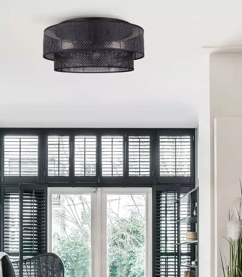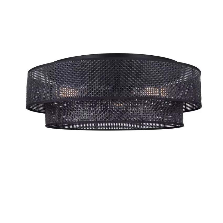 BELLAMY, IFM1149A19BK, flush mount, matte black, black rattan-style plastic shade, 3 x 60W C bulbs, 19″ W x 8″ H. Easy Connect™ included