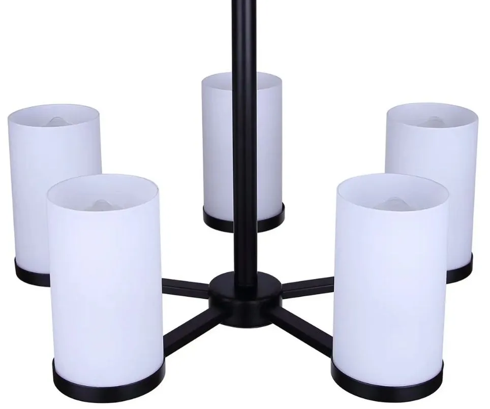 The BRITTON 5-light chain chandelier in matte black brings an effortless blend of refined minimalism and timeless style to your home. With its modern matte black finish and flat opal glass shades, this fixture complements both transitional and contemporary interiors, offering a bright, elegant focal point for any room. Measuring 21 inches wide and adjustable from 18.12 to 66 inches, this chandelier adapts to a variety of spaces and ceiling heights. The five-light design ensures ample illumination, while the open glass shades create a warm, inviting glow. Compatible with five 60W Type A bulbs, it’s perfect for dining rooms, kitchens, and entryways. Whether you’re updating your decor or completing a renovation, BRITTON offers a timeless statement with modern appeal.