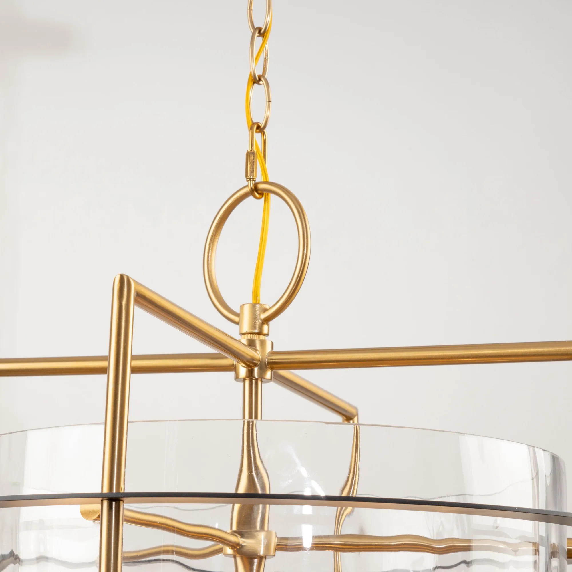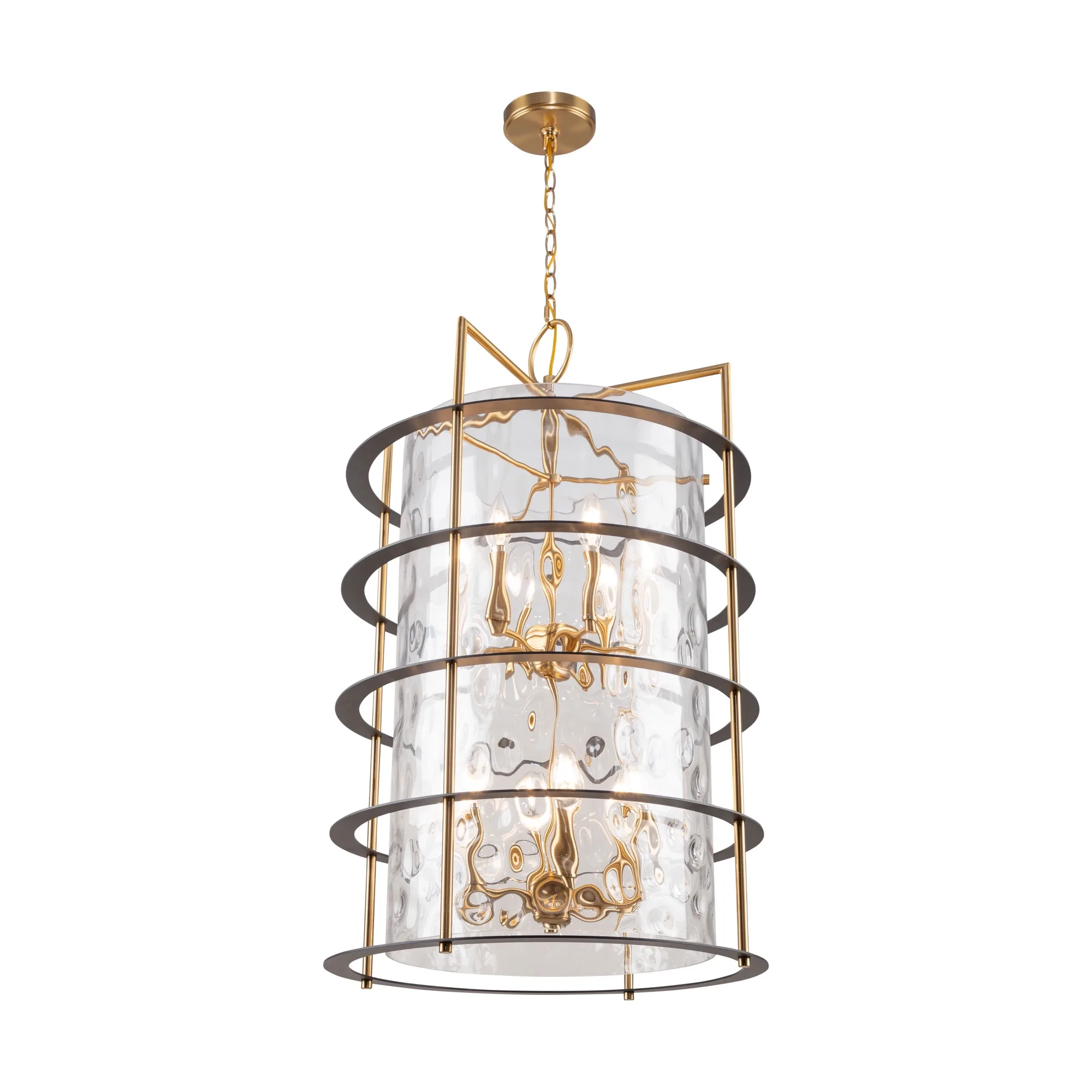 The Buford Collection is a striking ensemble that seamlessly blends elegance and modern design. Its defining features include a brass frame complimented with black rings, creating a contemporary contrast against the timeless appeal of the metal. The thick semi-transparent water glass add opulence and warmth, making these lanterns style chandeliers a sophisticated focal point for any space. 12 light lantern style chandelier for entrance, staircase, or foyer (height adjustable and compatible with sloped ceilings).