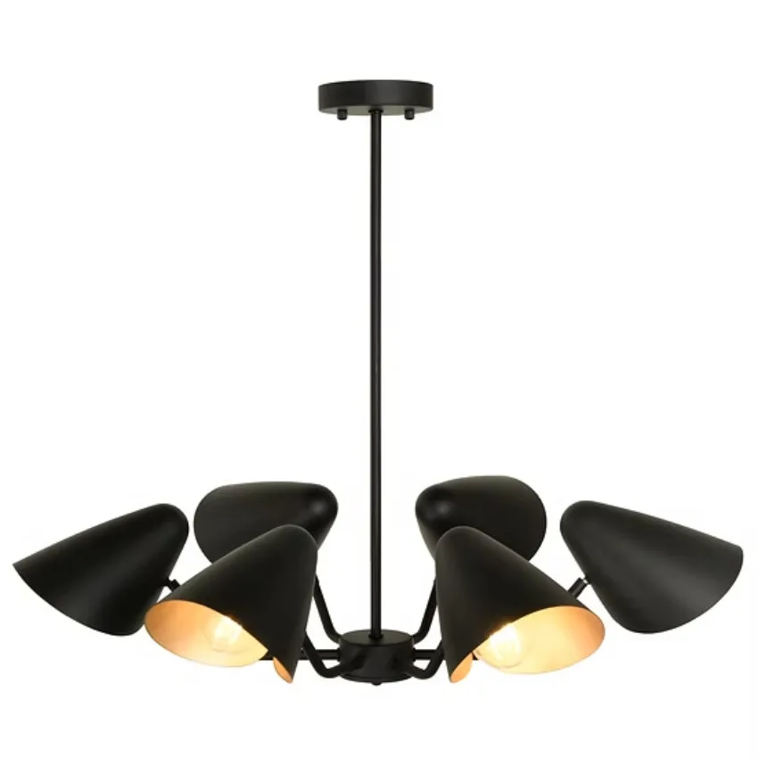 This black pendant light features a modern mid-century inspired design with six cone-shaped shades positioned in different directions to provide functional and well-distributed lighting. The gold interior of the shades creates an elegant contrast with the black exterior while helping reflect a warmer light. The central structure and metal arms give the fixture a balanced and contemporary look, making it ideal for a dining room, living room, or open space. Suspended from a central downrod, this fixture becomes a decorative focal point while providing effective ambient lighting.
