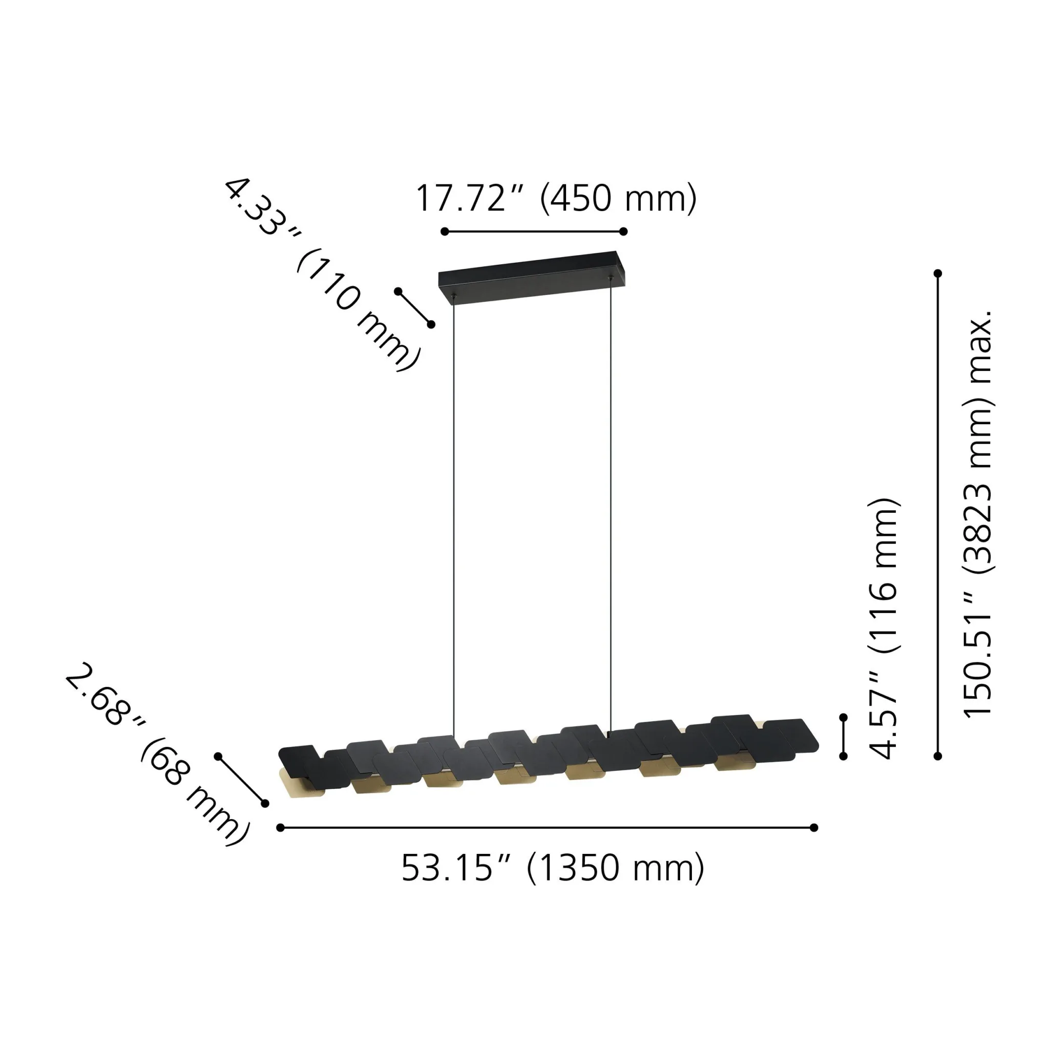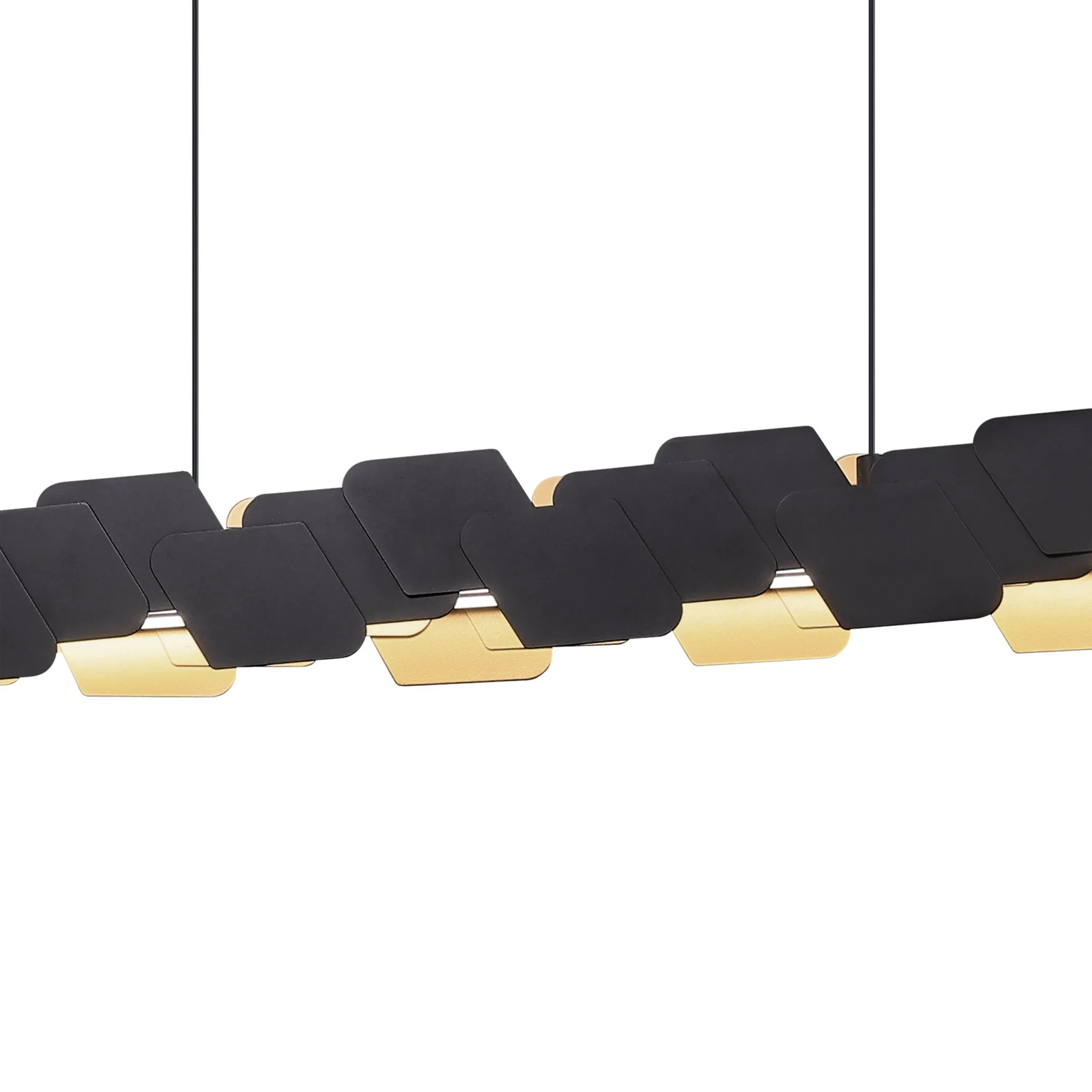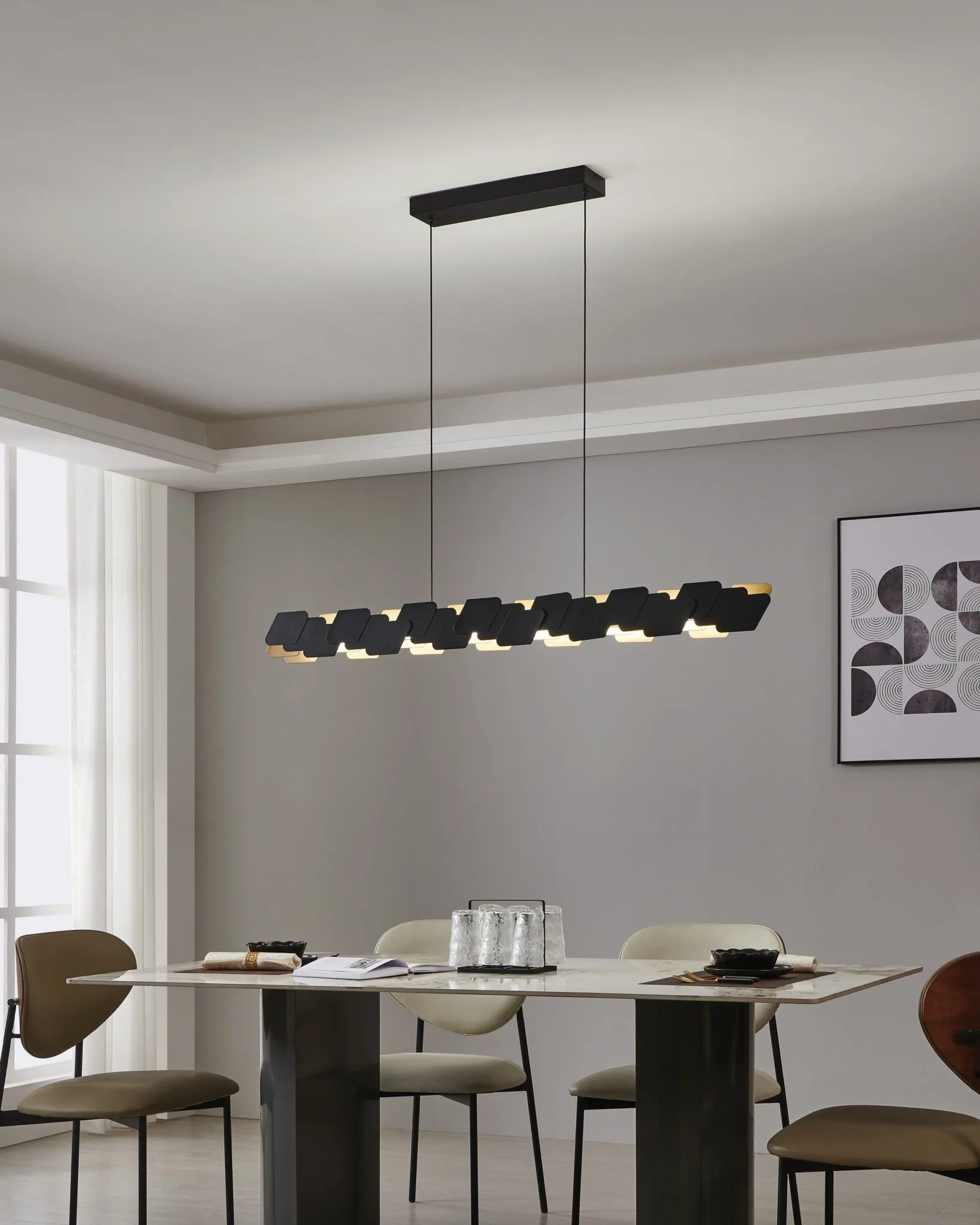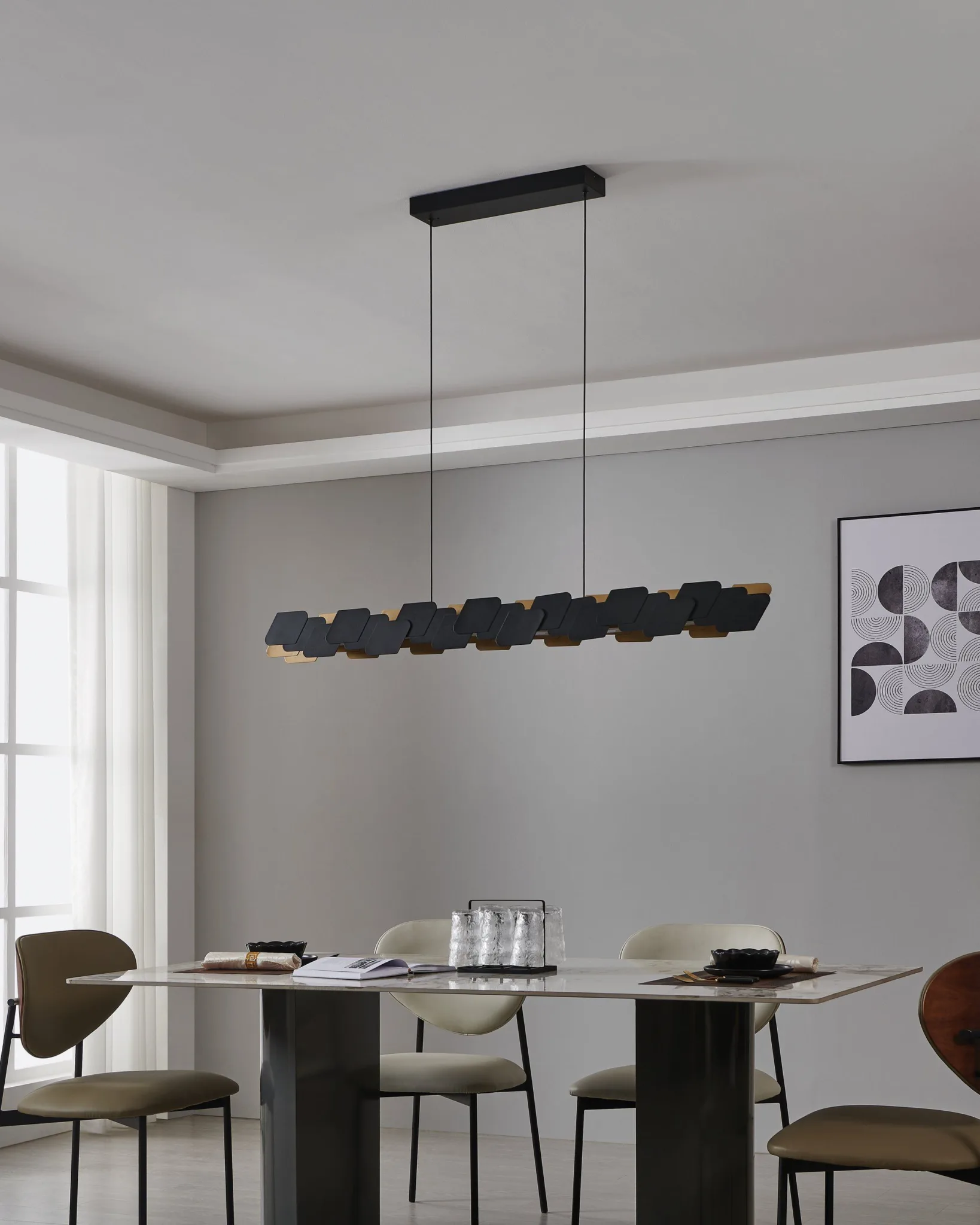 The Altagracia 390032A pendant light combines contemporary design with integrated LED technology to illuminate and enhance modern interiors. It features an elongated black and gold metal body composed of flat elements arranged in an offset pattern, creating a distinctive architectural look. The integrated LED light sources emit warm illumination both upward and downward, delivering a balanced and inviting lighting ambiance throughout the space.