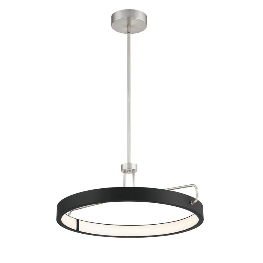 A black ring of LED light is suspended by two satin nickel or gold-finished metal rods on either side. An unconventional approach to a simple concept, this slightly retro yet trendy line features a simplicity that still attracts attention.