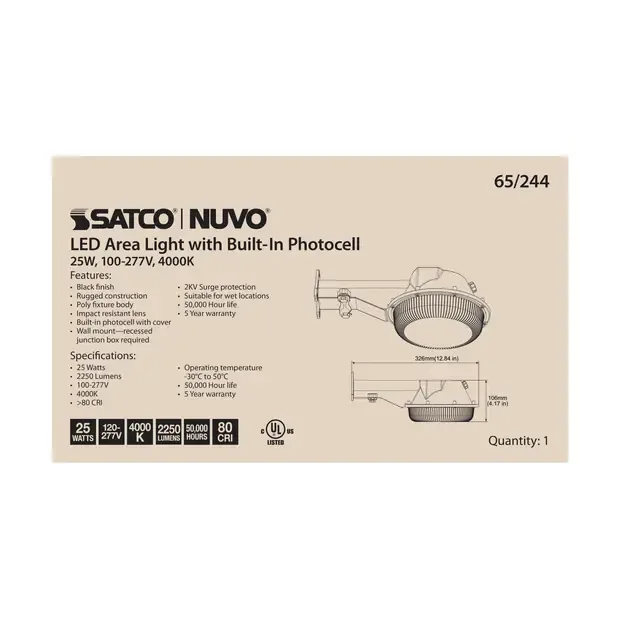 This LED outdoor area light is designed to deliver powerful, reliable, and automatic illumination for commercial and residential environments. Featuring a built-in photocell, it automatically turns on at dusk and off at dawn, enhancing energy efficiency and security. Its durable black construction is suitable for outdoor conditions, while the prismatic lens provides even light distribution. Ideal for parking areas, driveways, entrances, service areas, and building perimeters.