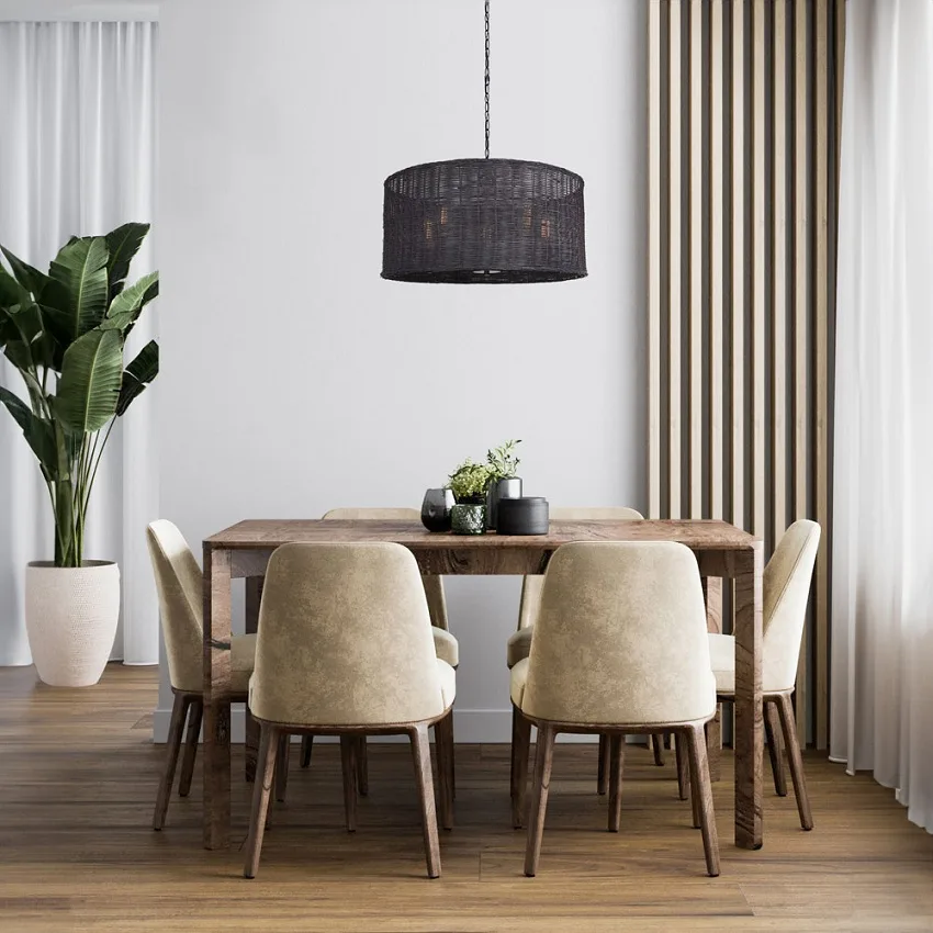 Bring natural texture into your home while providing relaxed lighting suitable for any space with REMEE. Inspired by bohemian style with a modern twist, REMEE features a hand-woven black rattan shade in a popular drum shape, adding both visual warmth and essential illumination to your interior.