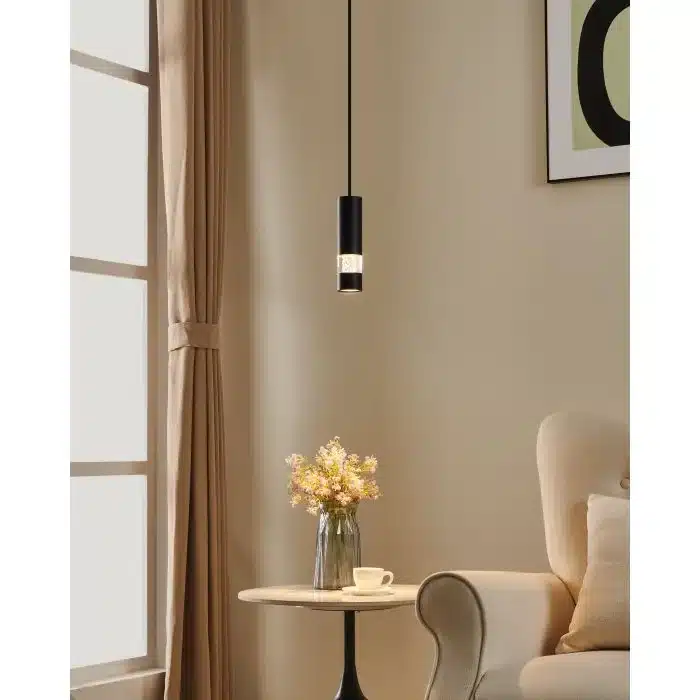 The black BERNABETA pendant by EGLO features a sleek, modern design. With its black cylindrical shade, clear diffuser, and warm LED light, it creates a cozy and contemporary ambiance. Perfect for enhancing kitchens, dining rooms, or living rooms with elegant and functional lighting.