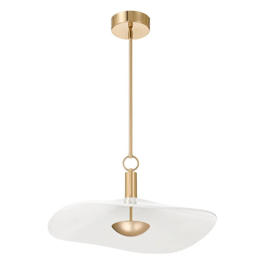 The Novella convertible pendant exudes understated luxury with its polished gold finish and sculptural ceramic form. Inspired by the gentle curves of lily pads, its hand-cast white glazed ceramic shade glows with soft warmth and refined texture.