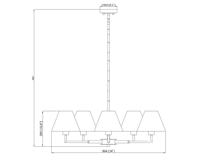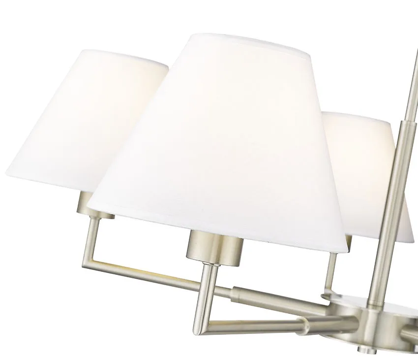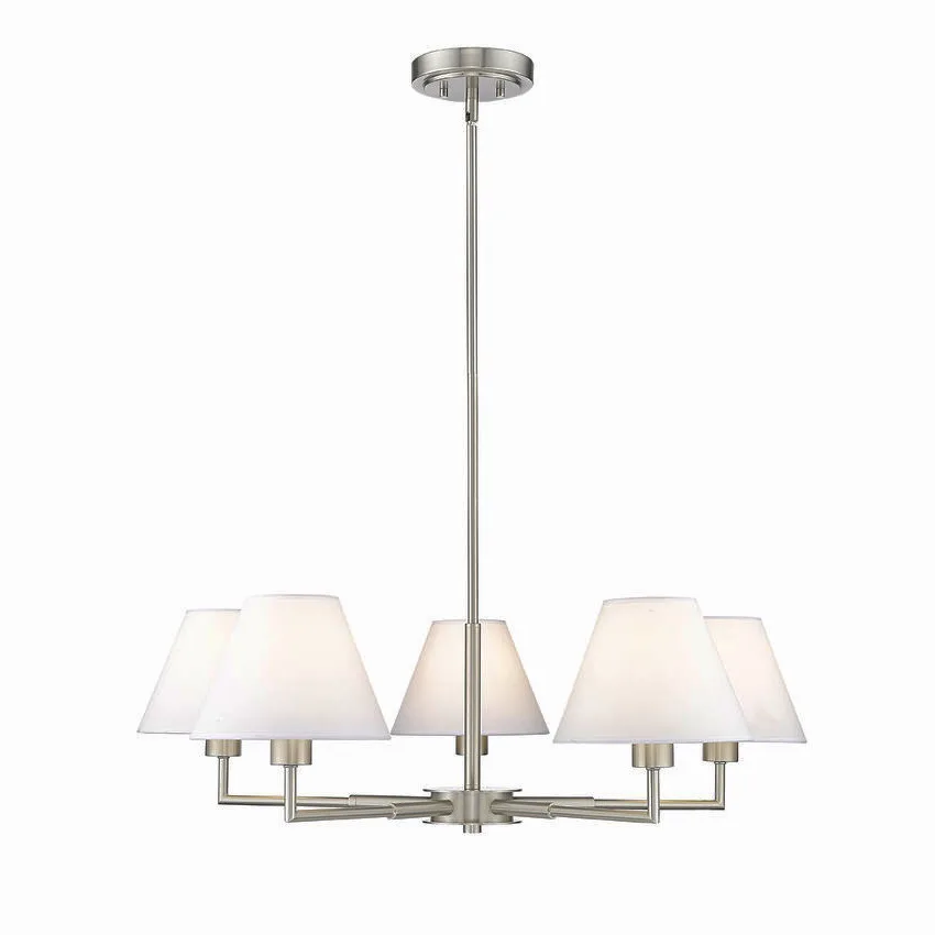 Modern flexibility of design plays up the chic, understated character of a five-light chandelier. Expertly designed with simplicity at the forefront, the chandelier pairs a brushed nickel finish frame with straight suspension and complementary angularity, all capped with conical shades that create the perfect hint of dimensionality for a fixture that looks great everywhere from the dining room to a bedroom dressing area.
