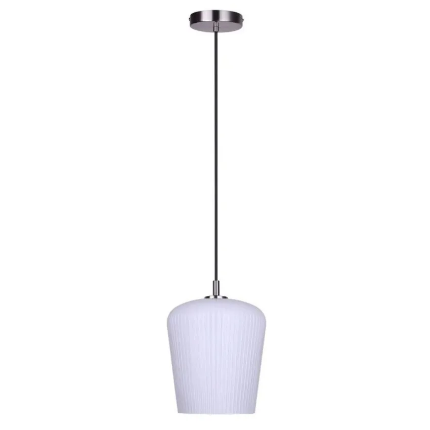 The LEANDRO 1-light corded pendant in brushed nickel provides a clean, grounded look to your space. Its ribbed opal glass shade adds depth and texture, offering a subtle elegance that fits seamlessly into modern homes.