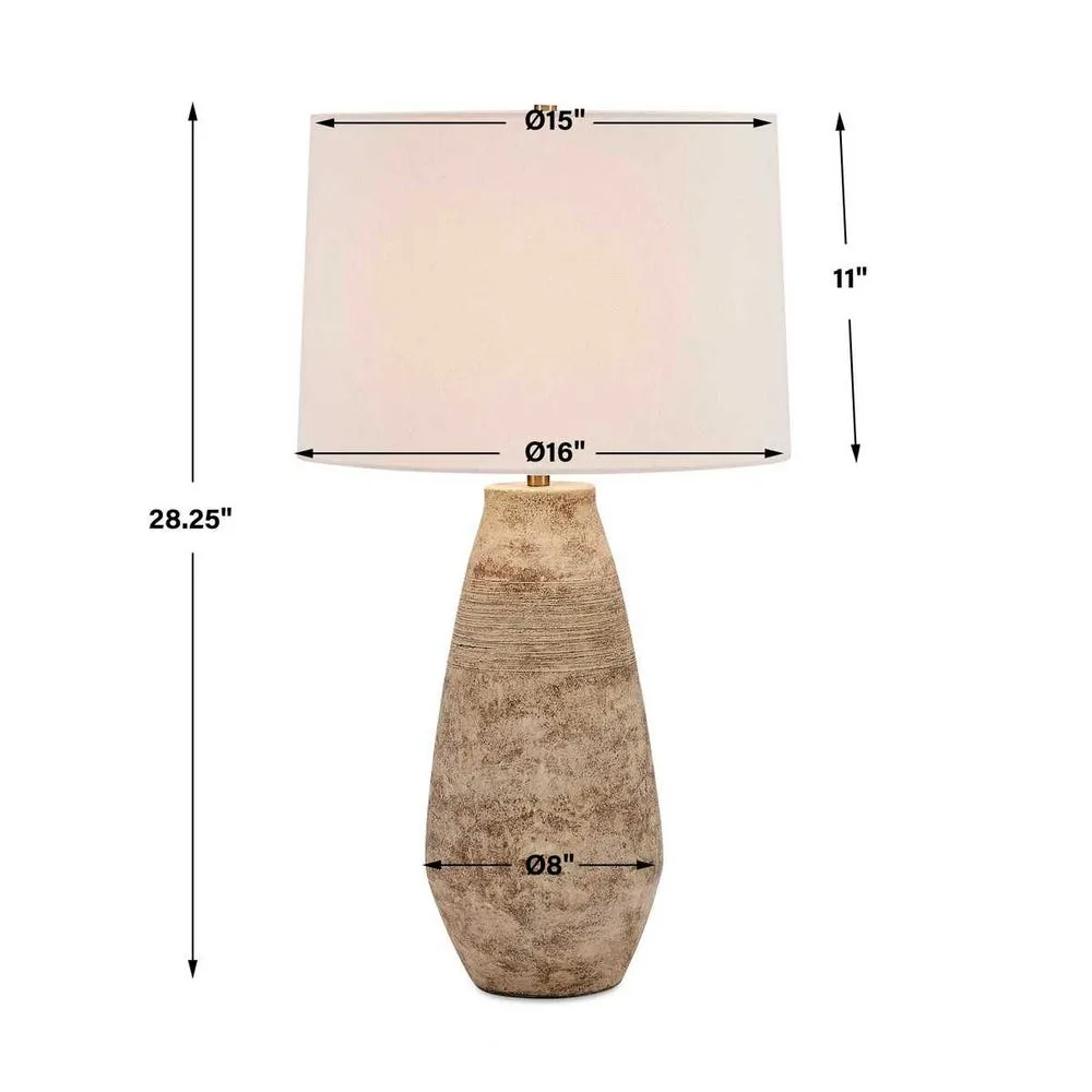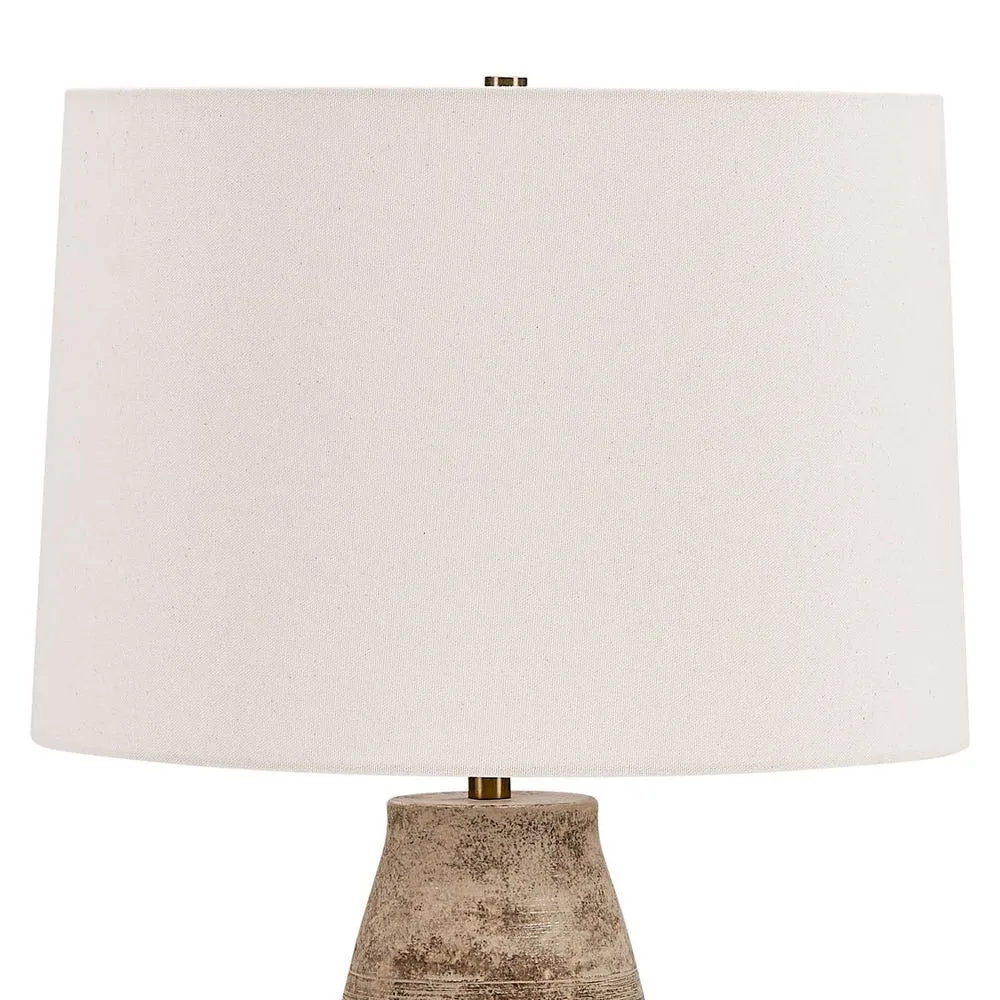 Affichant un style rustique décontracté, cette lampe de table en céramique présente un fini vieilli gris pâle patiné avec une texture subtilement nervurée et des sous-tons brun foncé, rehaussé de détails en laiton plaqué antique. Son abat-jour tambour rigide légèrement fuselé est recouvert d’un tissu de lin blanc chaud.