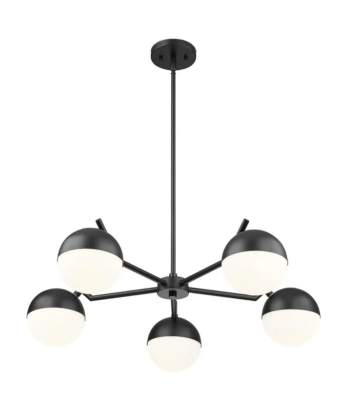 Add a playful touch to your living or dining space with this modern five-light chandelier. Its angular arms and orb-shaped shades create a dynamic silhouette for your living room or dining area. Metal screens on the shades and a sleek frame feature a matte black finish, maximizing contrast and depth in your interior.