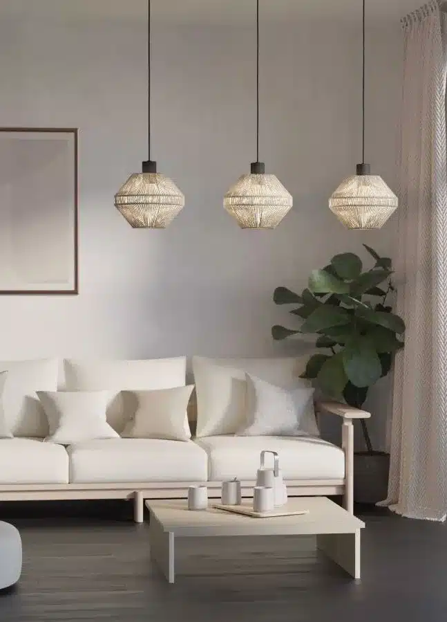 The Midsummer pendant features an organically shaped cream jute shade. The jute shade creates a warm and inviting glow when illuminated. This fixture combines striking materials and metals, delivering ambient lighting for any room with a Japanese-inspired style. The maximum cord length is 144″.