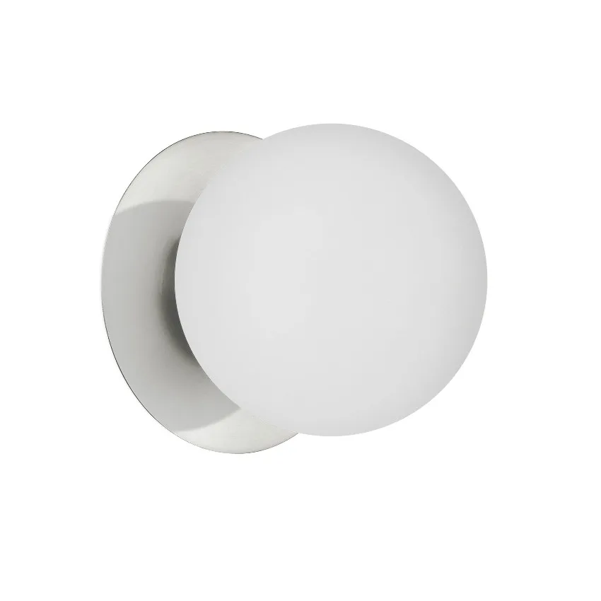 Decorative wall sconce with opal white glass. Its polished chrome (electroplated) metal finish and opal white glass diffuser provide a soft, even light. With its contemporary, understated design, it’s the perfect elegant addition to both modern and classic interiors.