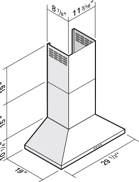 The 6-inch round vertical duct outlet ensures efficient air ventilation. The included telescopic chimney (15″ + 19″) fits ceilings up to 9 feet, with an optional extension available for ceilings up to 10 feet.