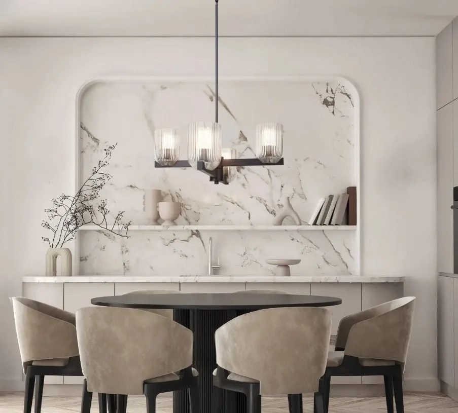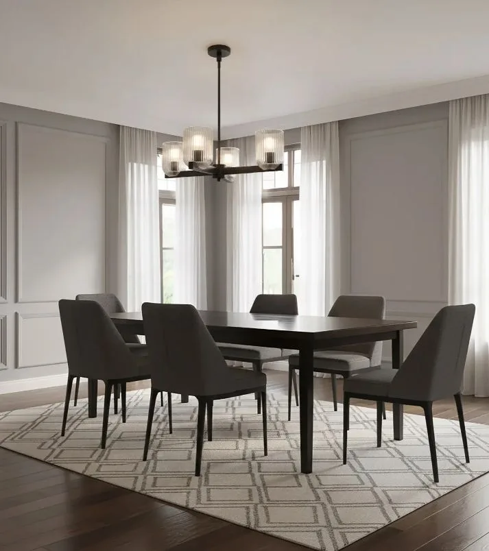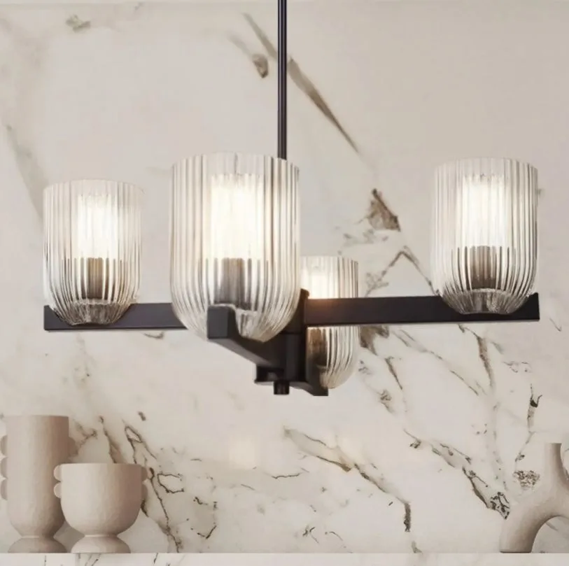 Le lustre RENZO marie une présence audacieuse à un luxe discret, avec sa structure noir mat et ses abat-jour en verre clair côtelé. Doté de quatre lumières, il offre un équilibre parfait entre robustesse et raffinement, diffusant un éclairage à la fois saisissant et accueillant. Le verre côtelé apporte texture et profondeur, contrastant élégamment avec la finition noire lisse pour un effet à la fois contemporain et intemporel. Avec une largeur de 23 pouces et une hauteur ajustable de 17,25 à 59,25 pouces, RENZO s’adapte facilement aux salles à manger, espaces de vie ou entrées.