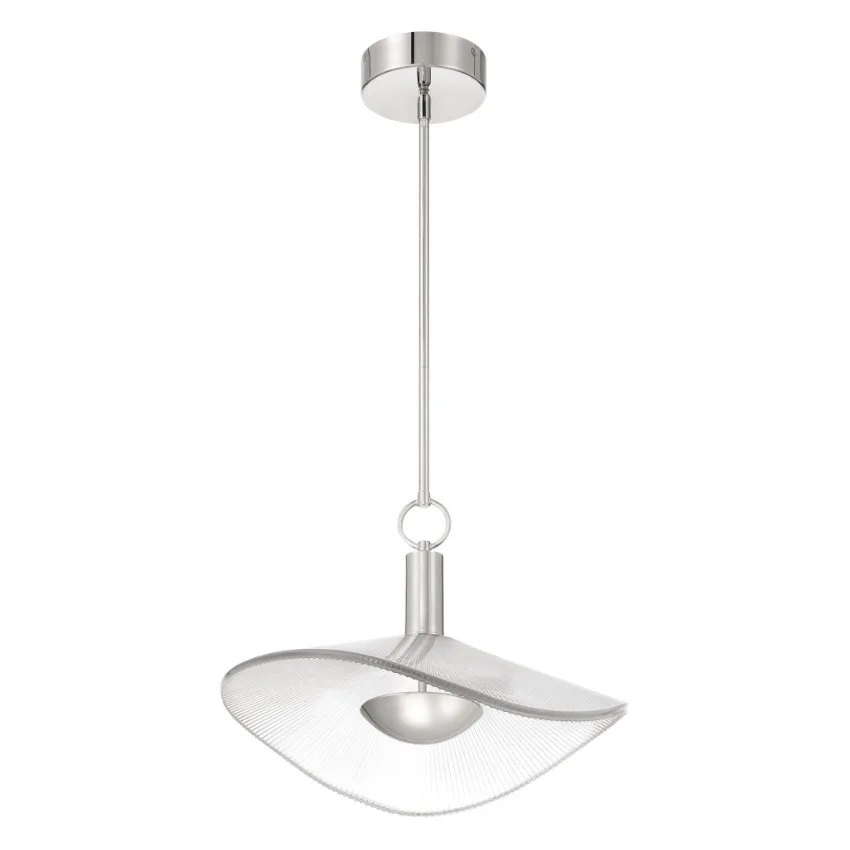 Le luminaire suspendu convertible Novella apporte une touche sculpturale à l’éclairage moderne avec sa finition nickel poli et sa forme délicatement courbée. Inspiré des lignes douces des feuilles de nénuphar, son abat-jour en verre clair nervuré capte et reflète la lumière avec une texture subtile et artistique.