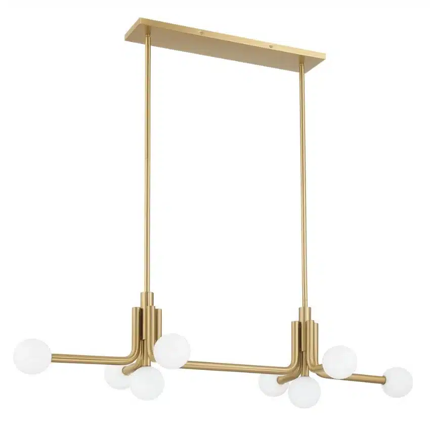Le lustre linéaire Stockholm en or champagne s’inspire du mobilier classique du milieu du siècle, offrant une présence à la fois ludique et élégante. Sa structure tubulaire en métal, aux bras délicatement courbés, est surmontée d’abat-jours en verre opalin doublé, proposant une interprétation renouvelée du style mid-century avec une touche de sophistication moderne. Doté de 8 lumières, ce luminaire raffiné et polyvalent s’intègre harmonieusement à une grande variété d’intérieurs.
