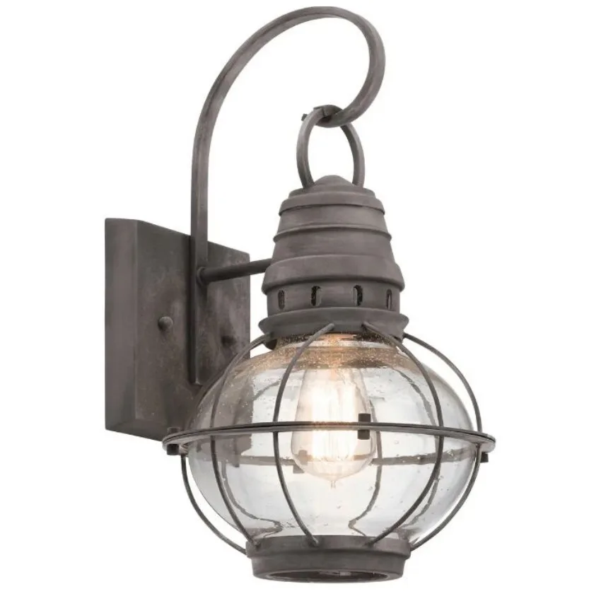 This 16″ wall lantern from the Bridge Point outdoor collection embodies the classic styling of nautical and railway lighting. It features a Weathered Zinc finish surrounding Clear Seeded glass.