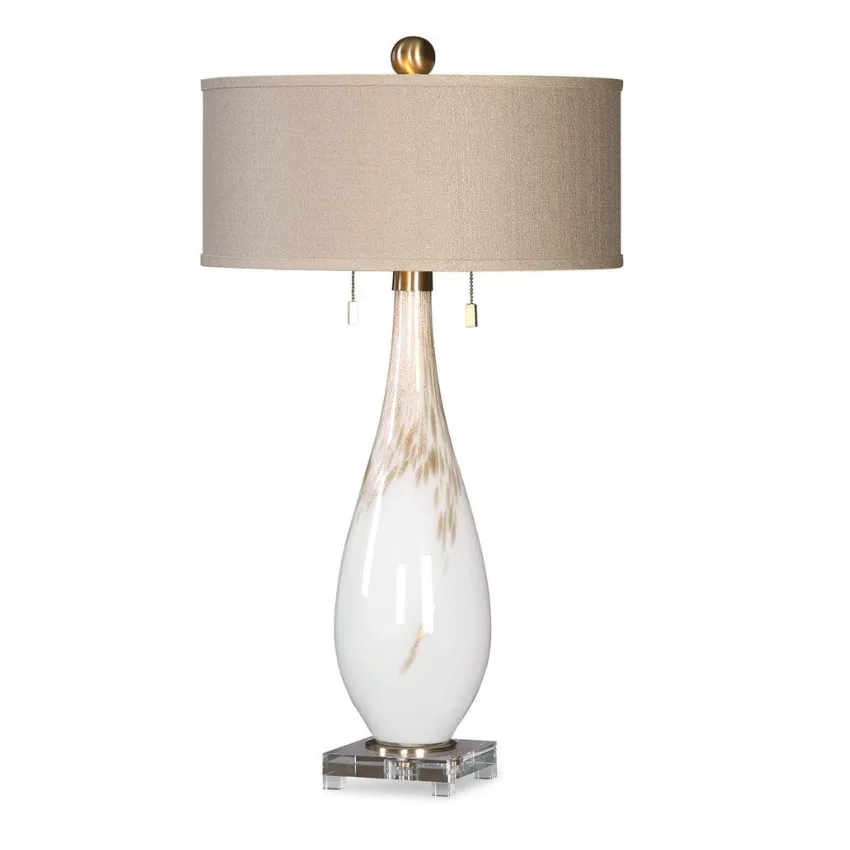 Verre blanc lustré aux nuances métalliques bronze doré, rehaussé de détails en métal plaqué laiton brossé et d’un pied épais en cristal. L’abat-jour tambour rigide rond est confectionné en tissu de lin bronze taupe avec un effet flammé naturel.