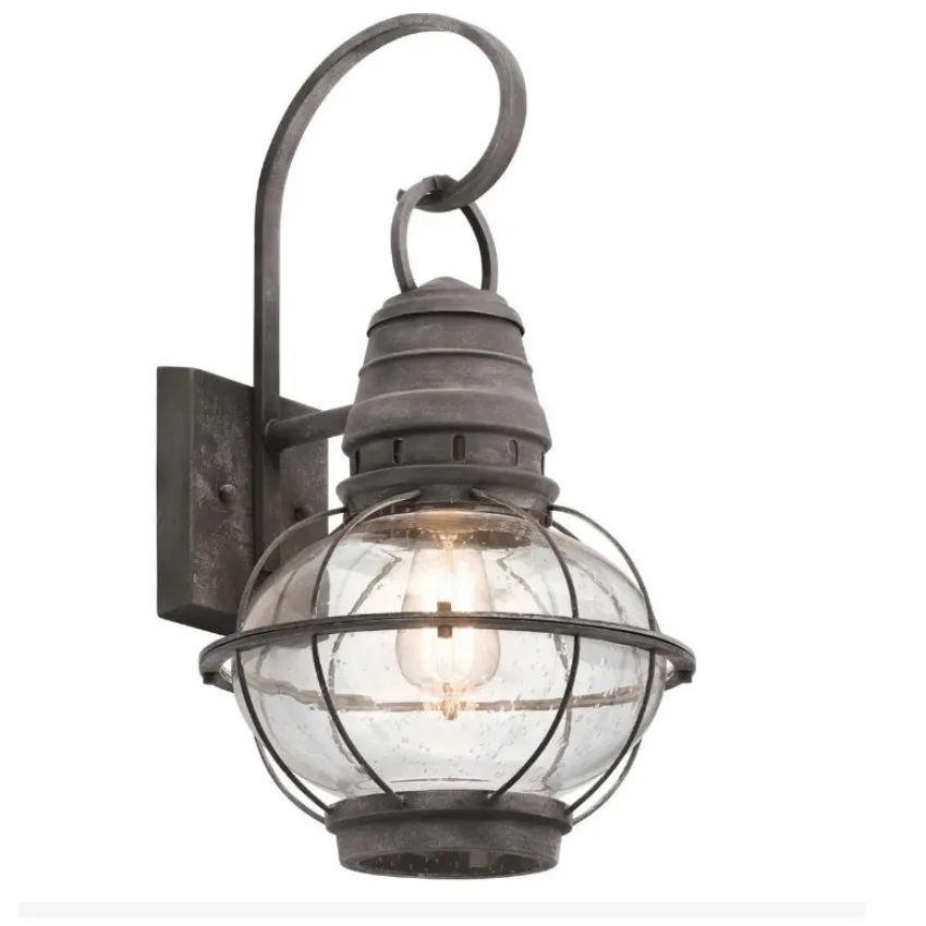 Cette lanterne murale de 20 po de la collection extérieure Bridge Point incarne le style classique de l’éclairage nautique et ferroviaire. Elle présente un fini zinc vieilli entourant un verre clair martelé