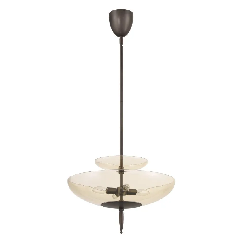 La suspension Fiorello capture le romantisme du design italien mid-century avec une silhouette élégante et un charme intemporel. Ses bras en bronze forgé soutiennent des abat-jours en verre ambré fumé qui diffusent une lumière chaleureuse et enveloppante, créant une ambiance douce et feutrée.