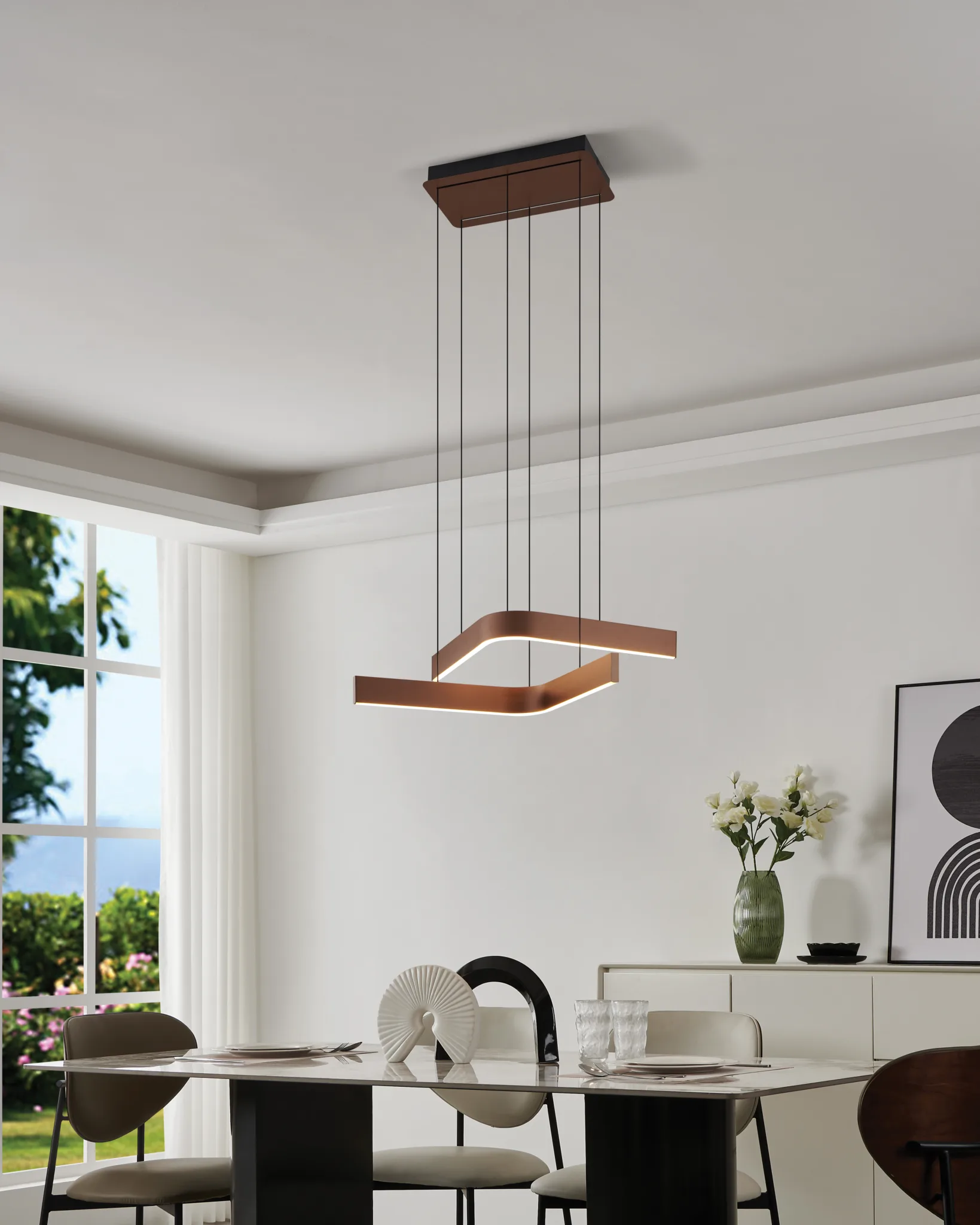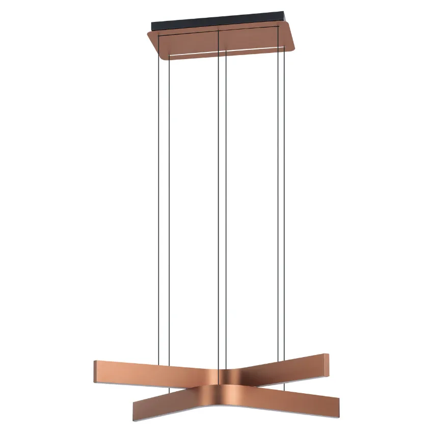 Cette suspension au design contemporain se distingue par sa silhouette sculpturale audacieuse qui attire immédiatement le regard. Suspendue par de fins câbles, sa structure composée de bras métalliques entrecroisés crée une forme géométrique moderne et artistique. Sa finition cuivrée chaleureuse apporte une touche d’élégance et de raffinement, tout en mettant en valeur les lignes épurées du luminaire. L’éclairage DEL intégrée est discrètement incorporée afin d’offrir une lumière uniforme et efficace, tout en soulignant l’aspect architectural de la pièce. Parfaite au-dessus d’une table à manger, d’un îlot de cuisine, dans une cage d’escalier ou un espace à aire ouverte, cette suspension allie design moderne et présence décorative marquée.