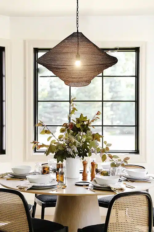 Cette suspension panier noire satinée avec fini en peinture poudre se distingue par sa large silhouette sculpturale et son design ajouré tissé qui laisse la lumière se diffuser librement tout en créant de superbes jeux d’ombres. Suspendue par une chaîne, elle apporte une présence industrielle marquée tout en demeurant légère et décorative. Fabriquée en fer, cette suspension ne nécessite aucun assemblage et est fournie avec une chaîne de 60″ pour une installation flexible. Avec ses dimensions généreuses de 30″ de diamètre par 21″ de hauteur, elle devient un véritable point focal au-dessus d’une table à manger, d’un îlot de cuisine ou dans un grand espace ouvert. Ampoule non incluse.