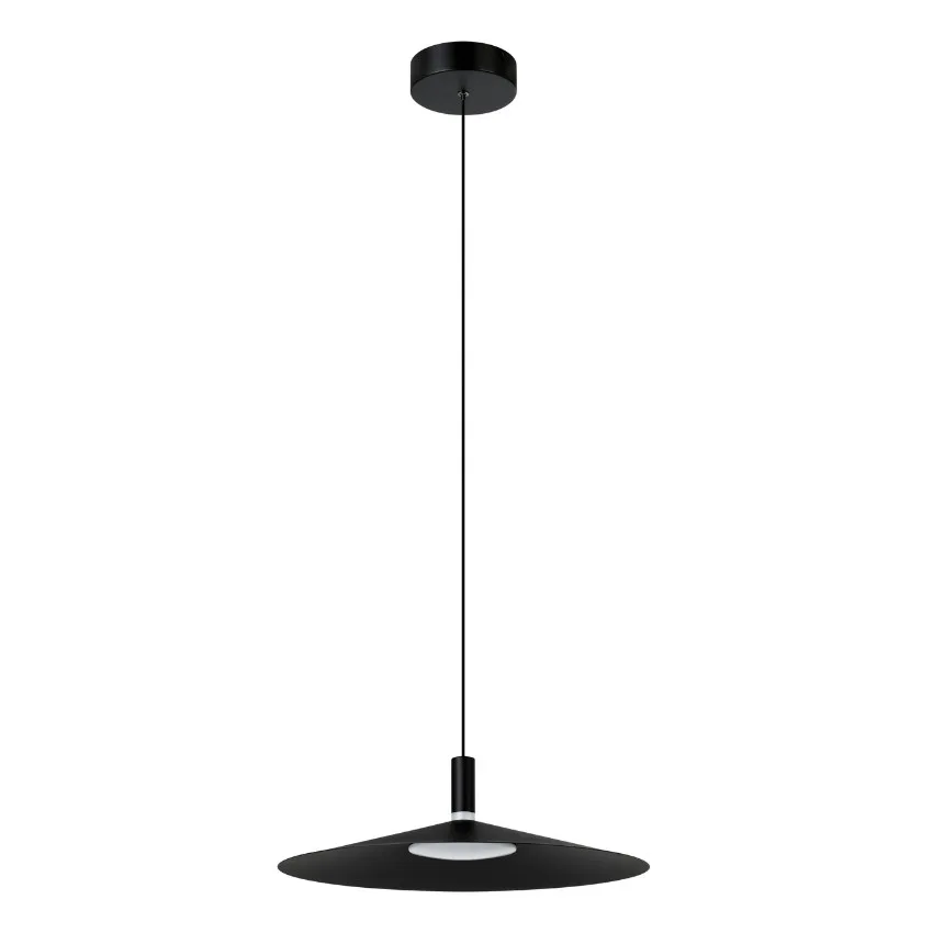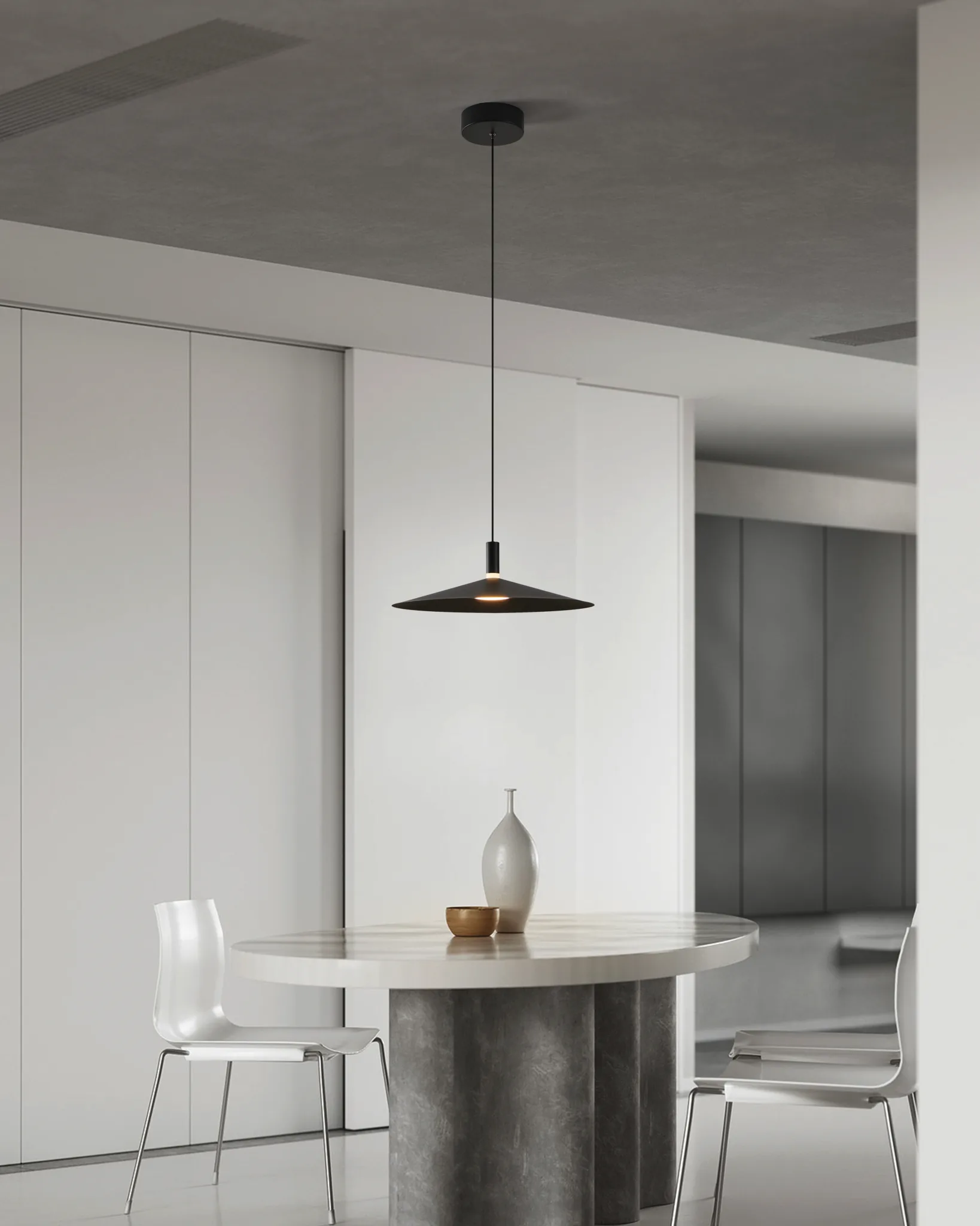 Cette suspension noire présente un design épuré avec un large abat-jour métallique et une silhouette moderne et élégante. Suspendue à une tige fine avec une rosace ronde, elle s’intègre parfaitement au-dessus d’une table à manger, d’un îlot de cuisine ou dans un espace de vie.