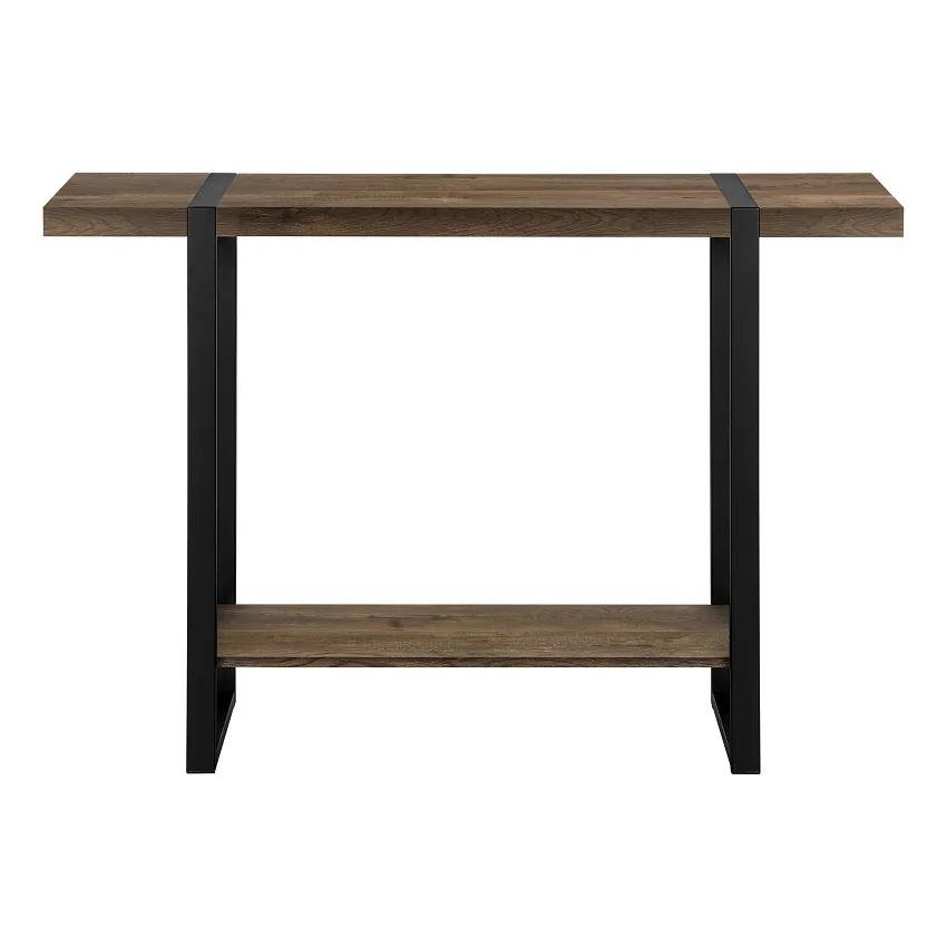 Le style de ferme industrielle combine le métal moderne avec une finition en bois rustique pour créer un look chaleureux et accueillant. Cette table console rectangulaire à deux niveaux incarne ce style populaire. Le plateau et la tablette inférieure sont finis dans un aspect de bois récupéré brun avec des variations de couleurs naturalistes et une texture subtile de grain de bois. Des pieds métalliques robustes au fini noir sont incorporés dans le dessus de table épais pour un contraste visuel saisissant et pour assurer la stabilité. Cette table d’appoint a un profil étroit qui la rend idéale pour une utilisation dans une entrée, un couloir ou derrière un canapé dans un salon.